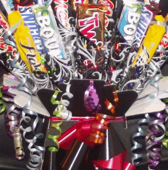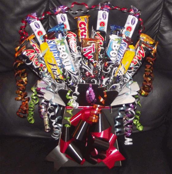 A beautiful bouquet containing chocolates for the standard size option and sweets, lollipops and candy for the large price option. We can also add some dark chocolate to your gift!