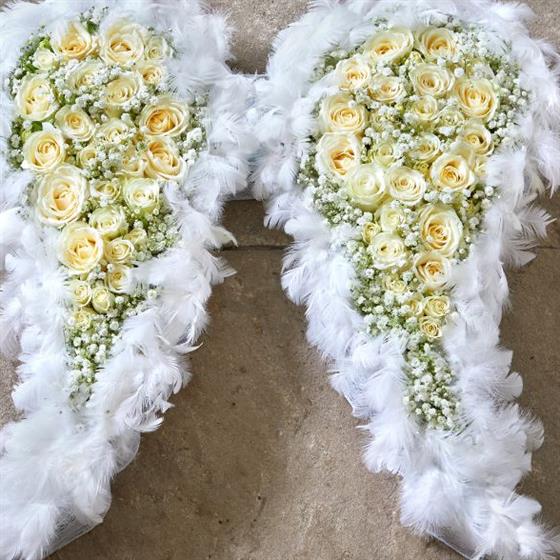 Guardians of heaven and spiritual angels in flight will protect and ensure sage passage to another life. Angel wings, with feathery outline and cream rose centres, signify carrying loved ones into the arms of God.
