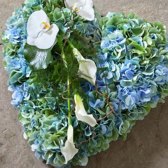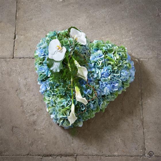 Blue Hydrangea creates a soft cradle for beautiful orchids and calla lilies within a small love heart. This serene and special tribute for a baby or child reflects cherished memories of tenderness.