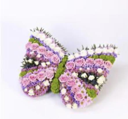 An array of pinks, lilacs, lime green and white make up this beautiful butterfly-shaped floral tribute. The display features spray chrysanthemums, pink and white roses, blue eryngium, lilac statice and lime green spray chrysanthemums.