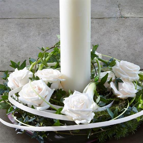 Lighting a candle of love commemorates the life of the deceased. It is a special arrangement to send to the bereaved to show you are thing about them. A candle arrangement is also used as a memorial and can be placed in a church at anniversaries. Soft and gentle this timeless arrangement will bring comfort at a time of sadness.
