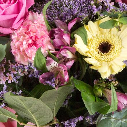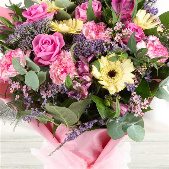 A delightful gift of lemon and pink blooms with a hint of lilac including roses and gerberas.