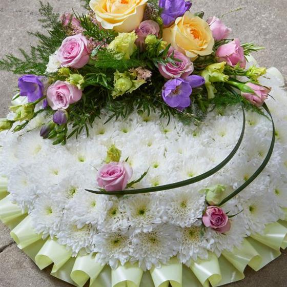 A traditional posy with a bed of chrysanthemum and a neat ribbon edge. Choice flowers, inlcuding fragrant freesia, make a perfect topper for this classic tribute. This design can be customised in the favourite colouring of the deceased.