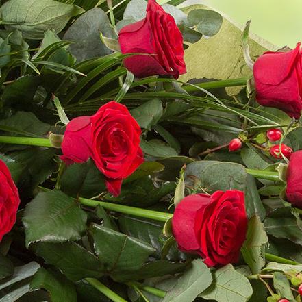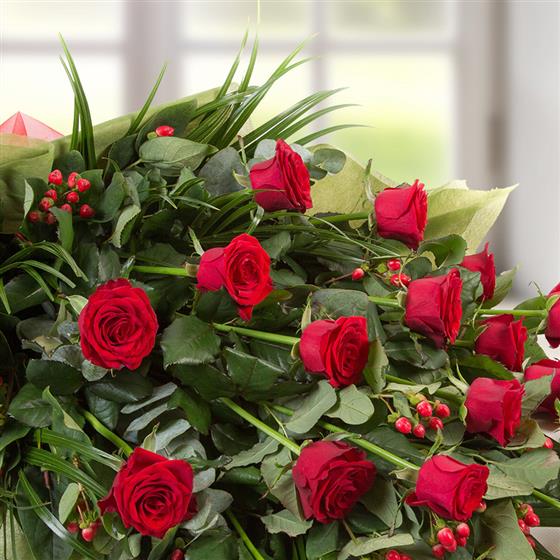 A simple, classic style bouquet of red roses, hypericum berries and unusual foliage. Choose from red, white, pink or yellow roses and either 12, 18 (as pictured) or 24 roses.