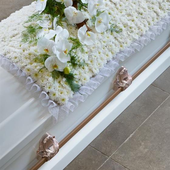 The stunning blanket will wrap around a loved one, with a cascade of elegant phalaenopsis orchids on a bed of chrysanthemums, makes this the ultimate bespoke tribute to show compassion and love.