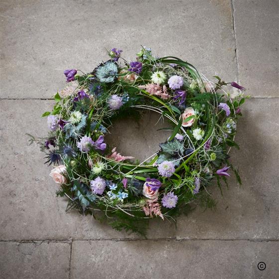 Clematis vines interweave with cottage garden flowers, givinging this wreath a soft, contemporary look. The subtle tones of lilic and pink are feminine and provide the abundant appeal of a country garden, ideal for gardeners and nature lovers.