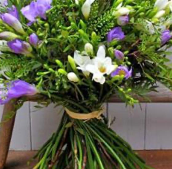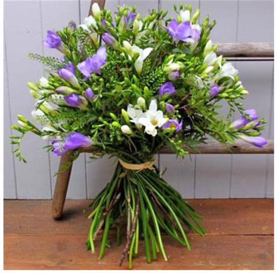 A hand tied bouquet of beautifully scented mixed freesia and seasonal foliage