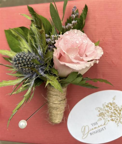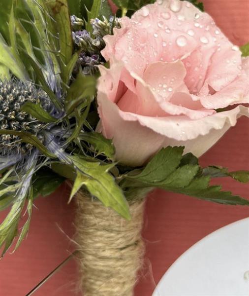 A lovely button hole with a thistle and spray rose or lisianthus. Designed with a sprig of limonium or wax flower depending on your style and finished with a string stem. Make a perfect accompaniment to any kilt or suit.