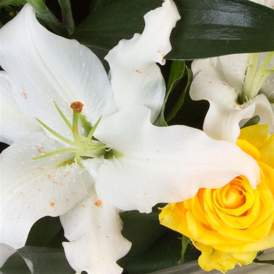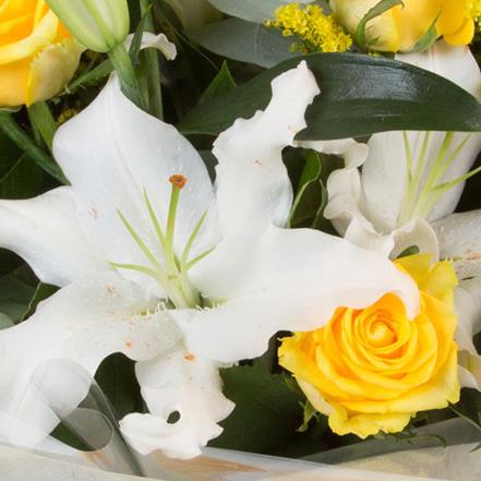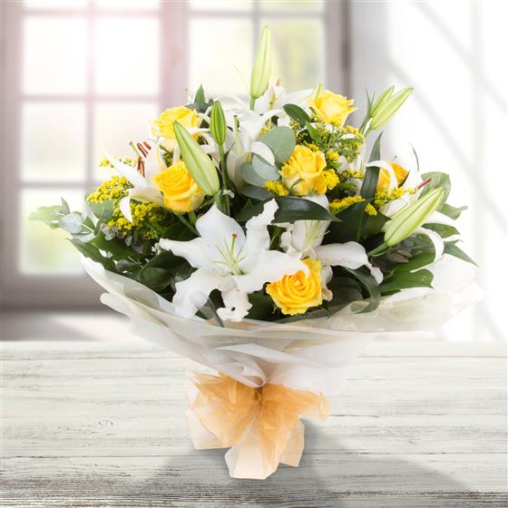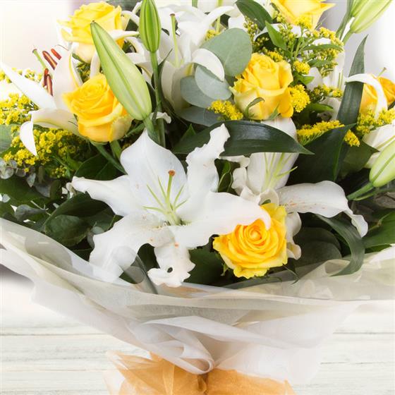 A fragrant delight of white oriental lilies and golden yellow roses mixed with solidaster and eucalyptus.