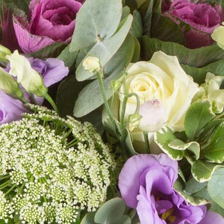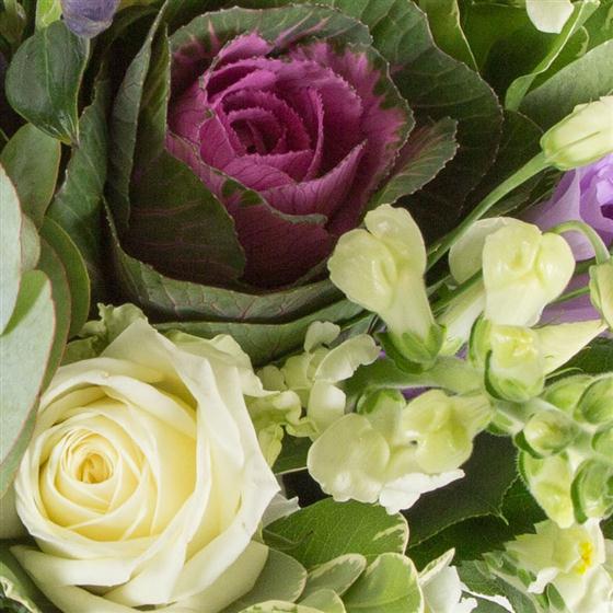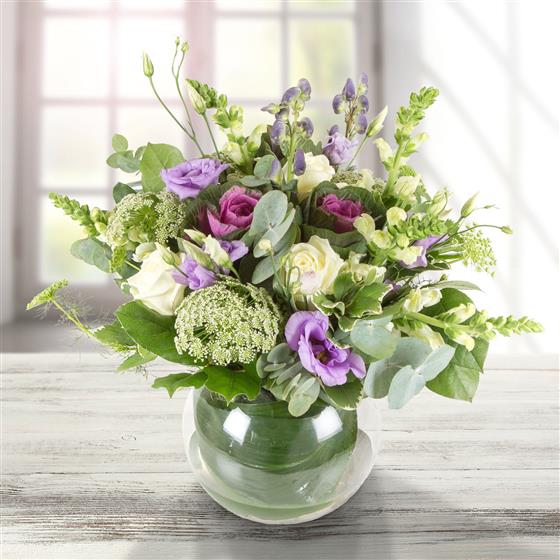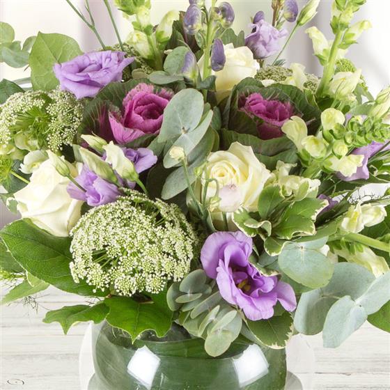 A stylish hand-tied arrangement of whites and lilacs, including roses and aconitum presented in a delightful glass vase or bowl depending on availability.