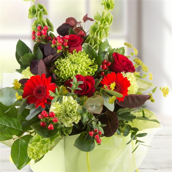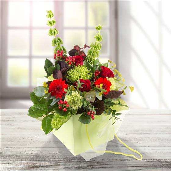 An unusual, vibrant gift bag of limes and reds, including molucella, shamrock bloom, roses and eucalyptus.