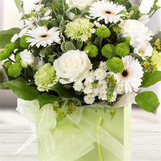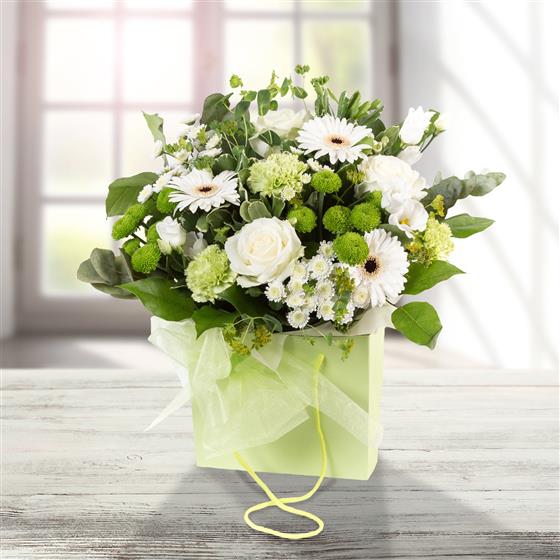 Vibrant limes and whites contrast to make this stylish hand-tied bouquet presented in a gift bag.