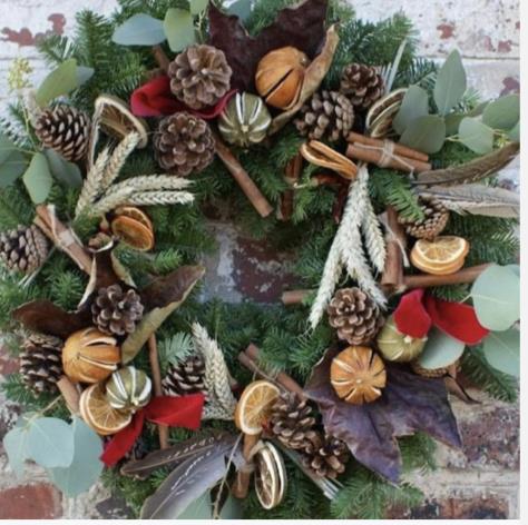 Fresh spruce door wreath including ribbon and cones and dried fruit. A perfect, long lasting gift.