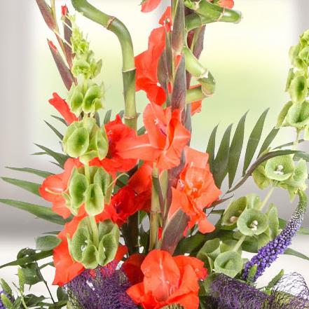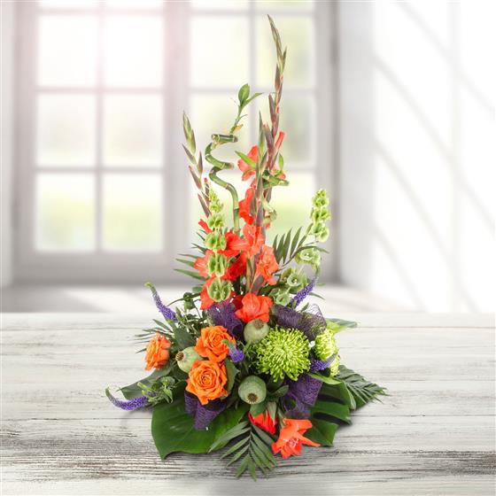 An imposing display of magnificent, contemporary blooms in tropical shades of purple, orange and lime.