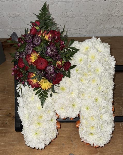 Our massed letter tributes are available with a white chrysanthemum base and sprays in a range of colours.