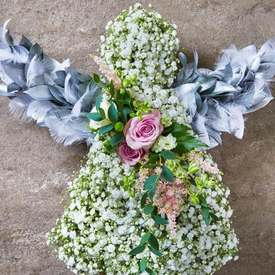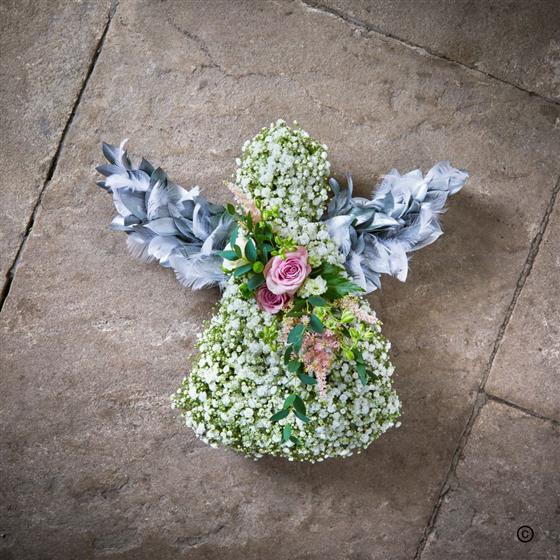 Another angel Lin heaven, this time angel made of frothy gypsophila with feather wings and a rose heat, will support you at this overwhelming time. Reminiscent of angels looking over and protecting a beloved child.