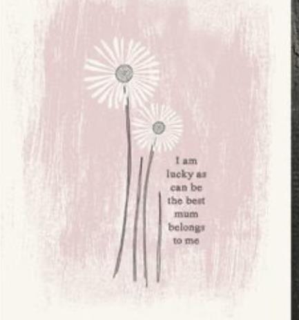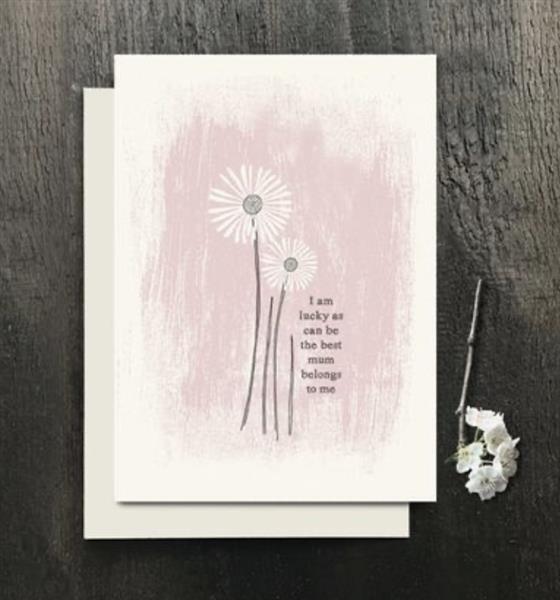 Dainty daisies in white and grey tones surrounded by a soft pink colour-washed background. Greeting reads: ‘I am as lucky as can be the best mum belongs to me’. Blank inside for your own message. Made from thick textured cream card and supplied with a matching envelope.