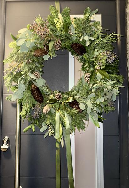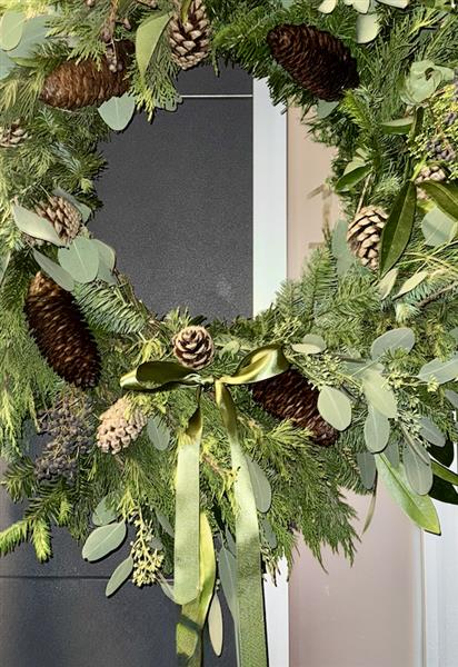 This beautiful wreath is full of mixed natural foliage including eucalyptus, Douglas fir, Ligustrum, finished with the bow of your choice.