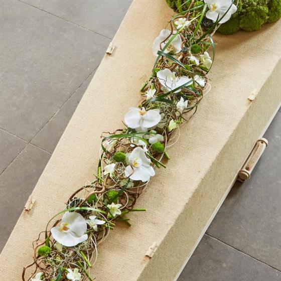 This unique and stylish coffin tribute features a lavish garland of orchids on a twig pathway. the garland tails from a natural moss wreath gently tipping over the confines side, creating an elegant and distinctive natural tribute.