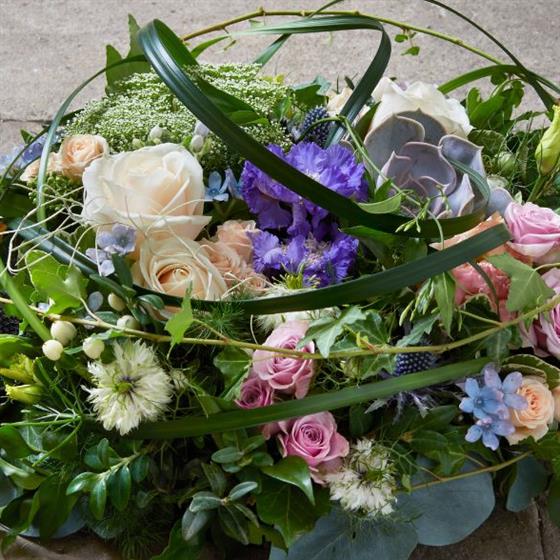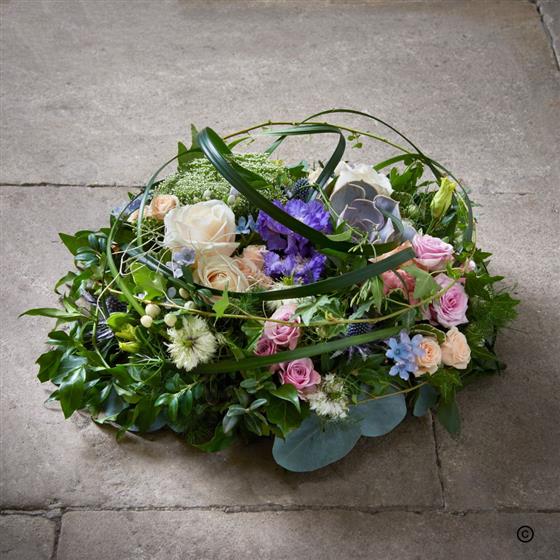 Verdant foliage and groups of colourful flowers create a natural feel to this circular tribute. The rustic look will appeal to anyone wishes to give a nostalgic last gift. This posy design can be made in many sizes
