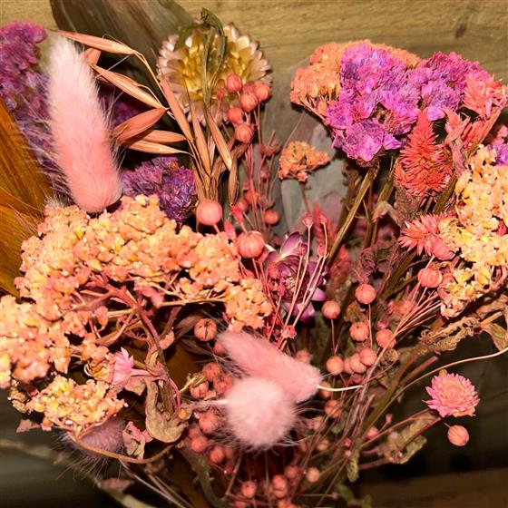 Mix of beautiful pink dried flowers wrapped in recyclable craft paper with raffia bow.
