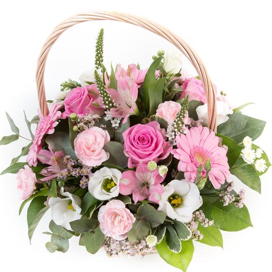 A dainty all round basket arrangement in light pink and cream tones as pictured or in your choice of colours.