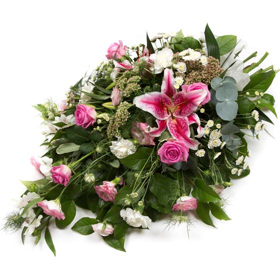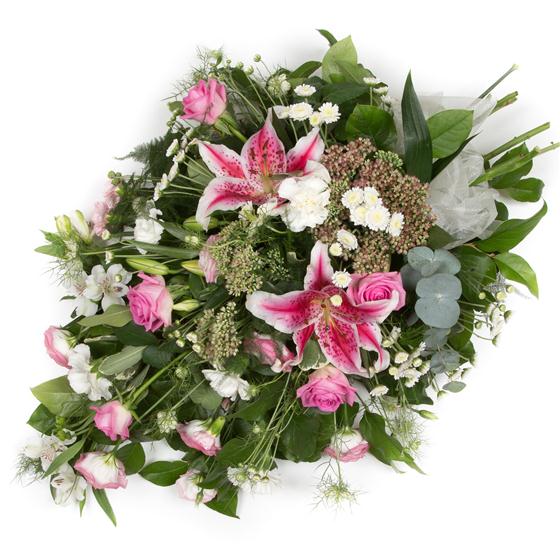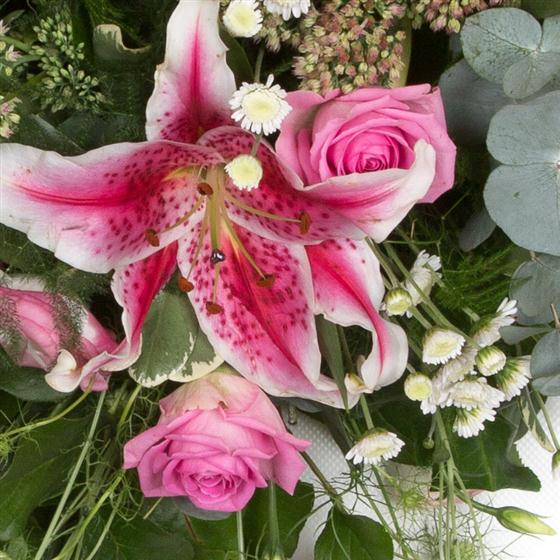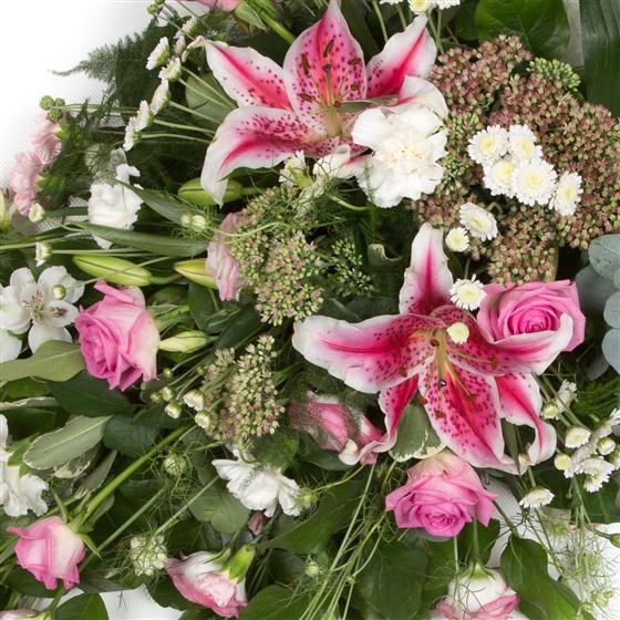 A pretty and feminine spray of pink and cream blooms including lilies, lisianthus and alstromeria with delicate nigella.