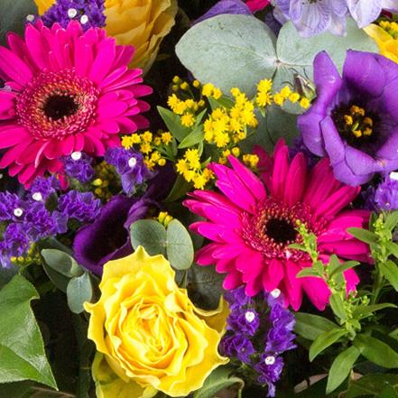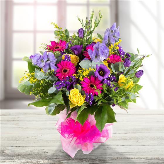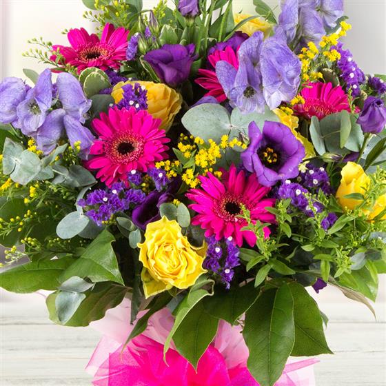Send a splash of colour with this bright and cheerful cerise, gold and purple hand-tied bouquet.