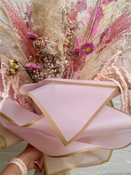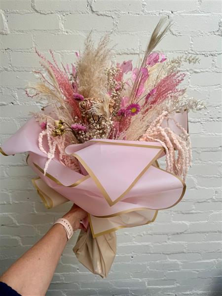 A beautiful bouquet of Pink and Cream Dried Flowers presented in a gorgeous wrap.