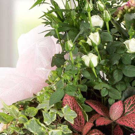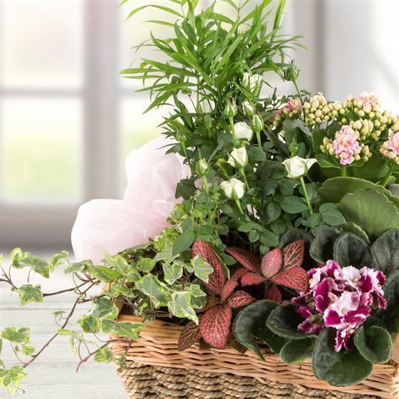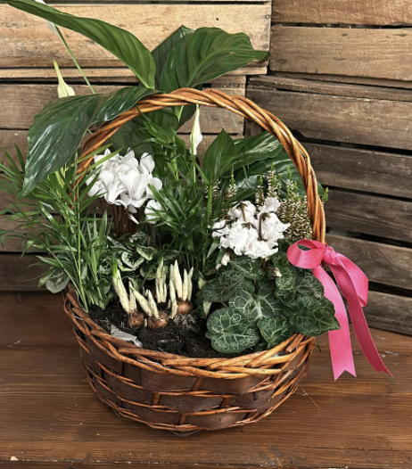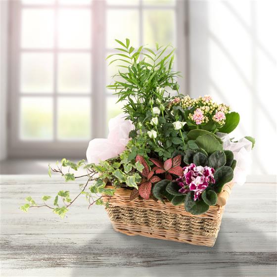 A long lasting gift of seasonal flowering and non-flowering plants presented in a tradtional basket.