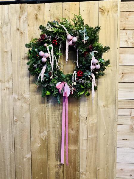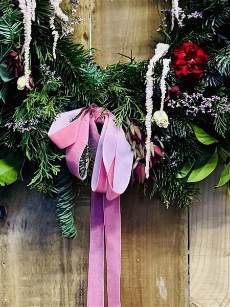 A beautiful mixed foliage wreath. Featuring touches of pink giving it a modern design with a beautiful pink velvet ribbon