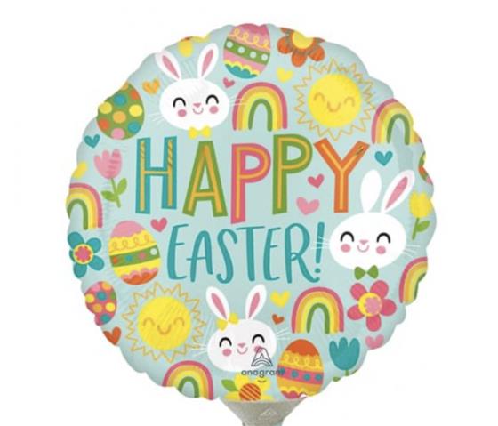 Colourful round foil balloon featuring many Easter icons such as: Rabbits, Easter Eggs and flowers.