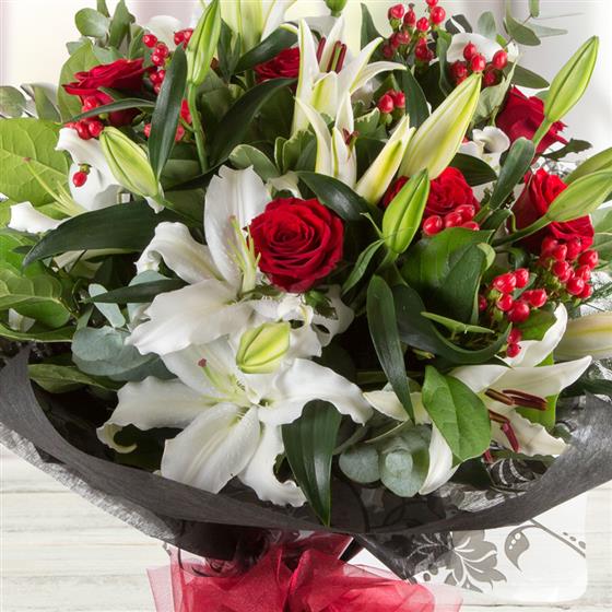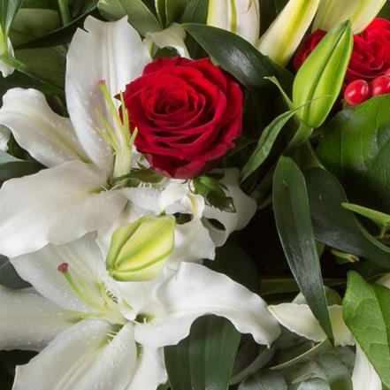 An beautiful display of highly fragranced white lilies and fabulous red roses mingled with a variety of foliage.