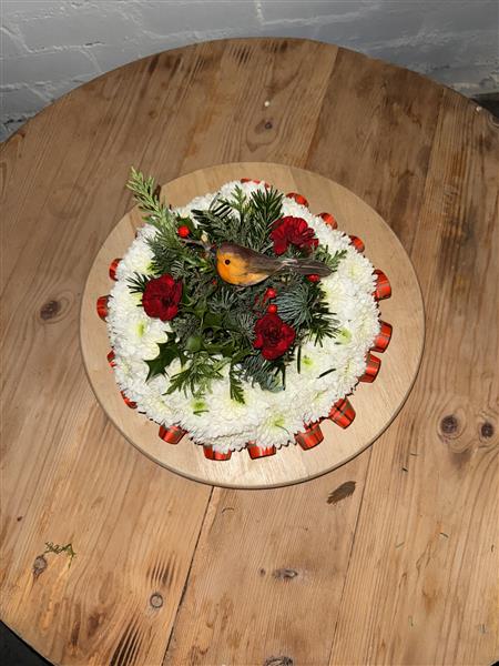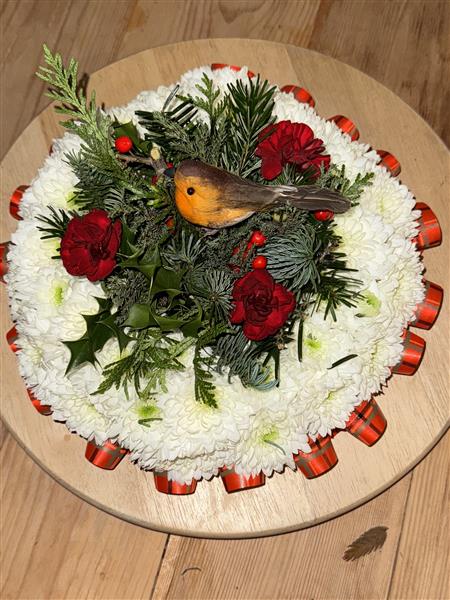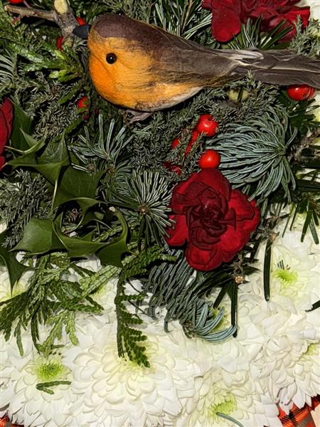 A festive tribute for a loved one. With white chrysanthemums circling fresh foliage with a nesting robin symbolising a loved one’s presence.