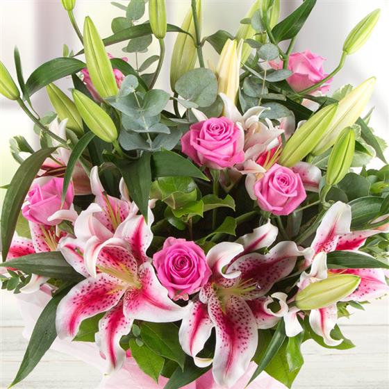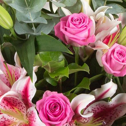 Pink roses and pink stargazer lilies combined with palm leaves and eucalyptus create a pretty array that is a joy to the senses.