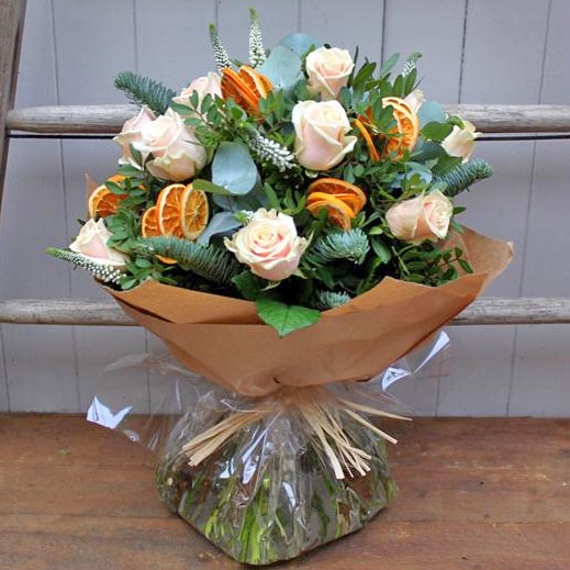 Palest roses, white veronica, eucalyptus and dried orange slices are the ingredients of this unusual beautifully scented hand tied bouquet.