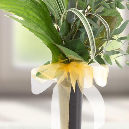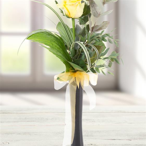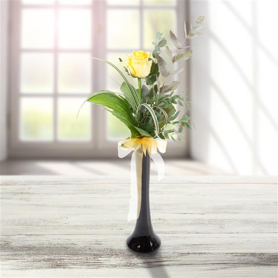 A single long stemmed yellow rose presented in a vase with mixed foliage sends a simple message.