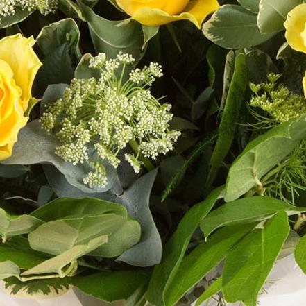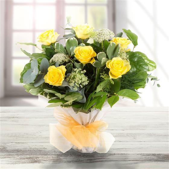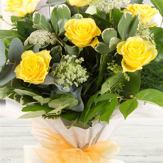 A hand-tied bouquet of long stemmed golden yellow roses complemented with varigated foliage presented in water.