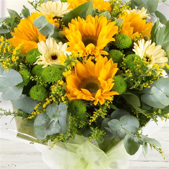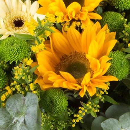 Sunflowers, mini gerberas and lime green kermit chrysanthemums hand-tied with seasonal foliage and golden solidaster.