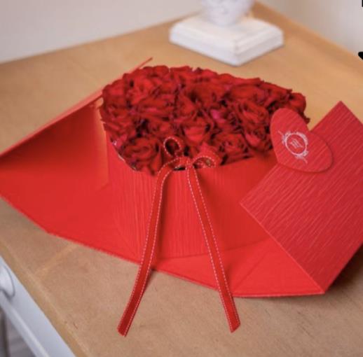 A delightful flower arrangement hidden inside a heart surprise box filled with red roses.