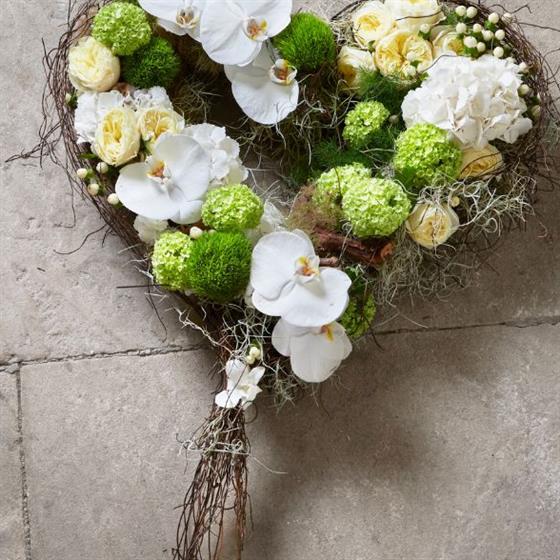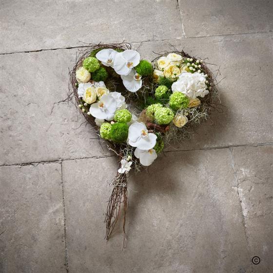 A natural heart made on a recyclable base is a sustainable option for minimising the impact caused to the earth. The twig-framed base holds a magical selection of distinctive flowers to reflect fond memories share