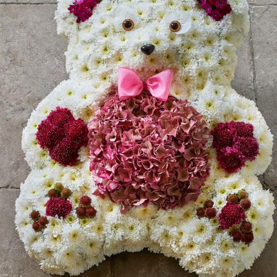 Special hugs for a precious infant from a floral teddy bear, reminiscent of their favourite cuddly toy. A cute teddy bear is the first-choice tribute for children and can be created in various colours.