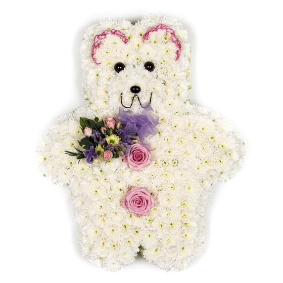 A small teddy bear tribute, measuring 19" (48cm) in height, available as pictured with a chrysanthemum base and complementing sprays in a range of delicate pastel shades.