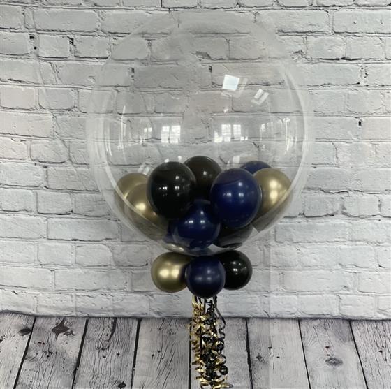 A mix of of blue, black and gold balloons placed within our 24” bubble balloon. Helium filled and delivered in a tissue lined box.