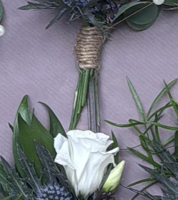 Button hole with thistle limonium and greens