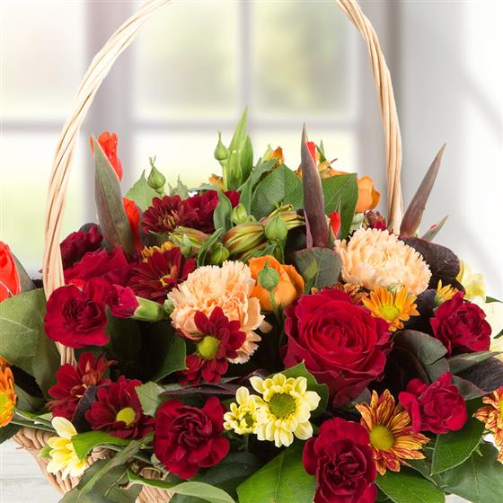 A rich mix of deep reds, rusts and golds. Including roses, spray carnations, alstromeria and chrysanthemums.