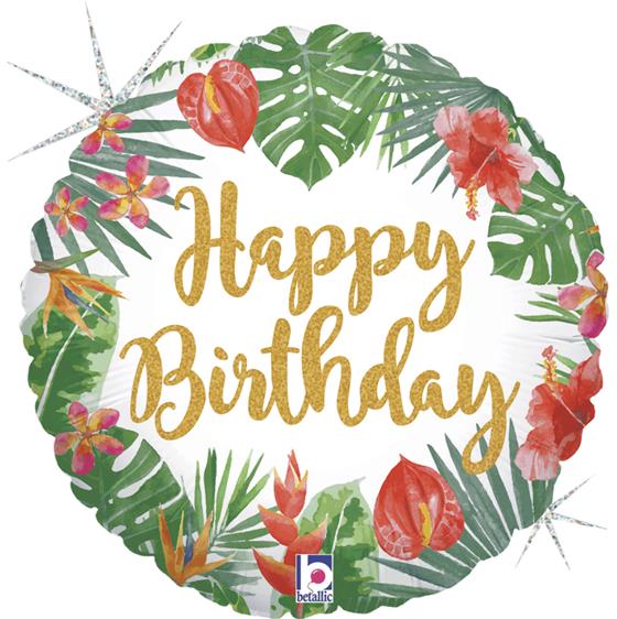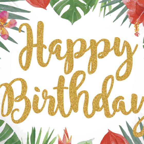 This 18" foil balloon is decorated with a tropical flower printed border that surrounds the message 'Happy Birthday' printed in a gold holographic script. A great addition to a Hawaiian themed summer party!