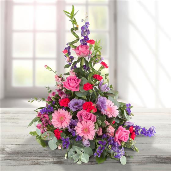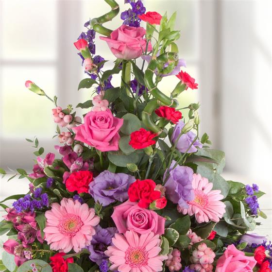 A beautiful, front facing arrangement in bright pinks, striking purples and lilacs.