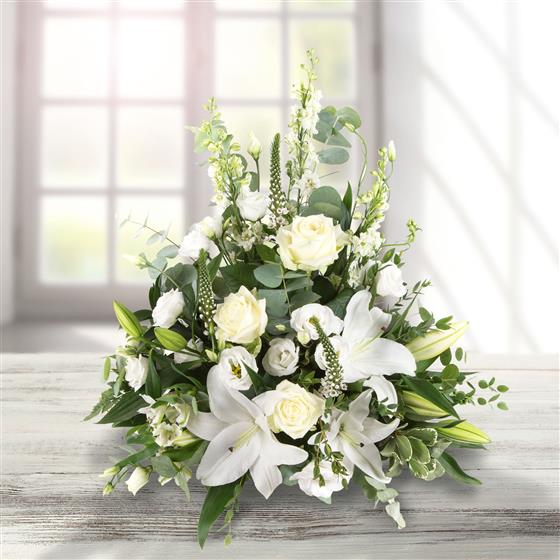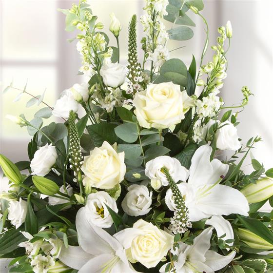 A front facing arrangement of white and cream blooms including roses, scented lilies and lisianthus. This arrangement is presented in a basket.