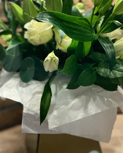A fragrant hand-tied bouquet of oriental lilies and white roses mixed with eucalyptus.